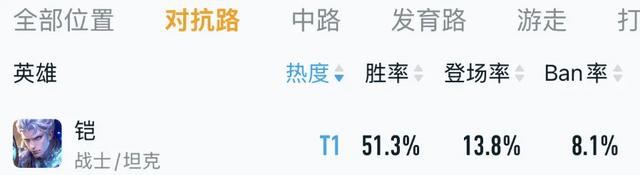 铠最近在对抗路表现的不错,胜率有51.3%,登场率也有13.8%,是对抗路的T1